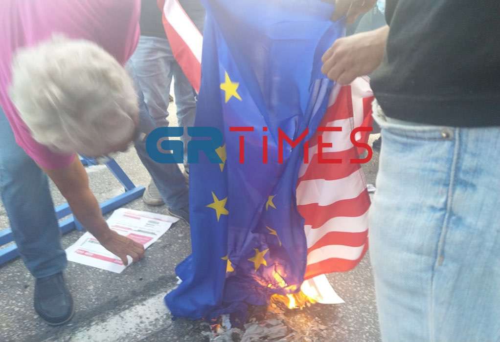 Ομάδα εκπαιδευτικών που έφτασε πρώτη μπροστά στα προστατευτικά κιγκλιδώματα του Βελλιδειου έκαψε λογαριασμούς ρεύματος και τις σημαίες της ΕΕ και των ΗΠΑ σε ένδειξη διαμαρτυρίας για την ακρίβεια.
