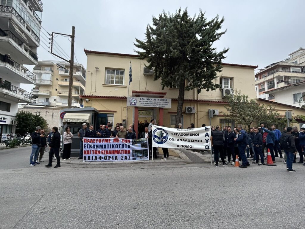 Η Ένωση Αστυνομικών Υπαλλήλων Θεσσαλονίκης προχώρησε σήμερα το πρωί σε διαμαρτυρία έξω από το αστυνομικό τμήμα Ευόσμου προκειμένου να στηλιτεύσει την υποστελέχωση των υπηρεσιών.