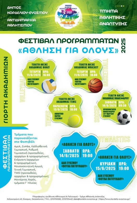 Από την Τετάρτη 11 Ιουνίου έως και το Σάββατο 14 του μήνα θα πραγματοποιηθούν και οι τελετές λήξης των αθλητικών ακαδημιών του Δήμου Κορδελιού – Ευόσμου για την περίοδο 2024 – 2025.