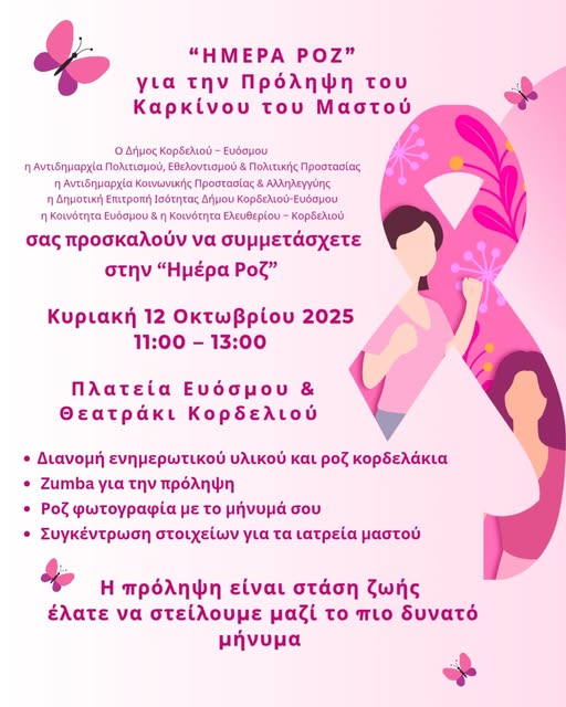 Οι εκδηλώσεις έχουν τίτλο «Ημέρα Ροζ» και θα πραγματοποιηθούν την Κυριακή 12 Οκτωβρίου, από τις 11:00 π.μ. έως τις 13:00 μ.μ., στην κεντρική πλατεία Ευόσμου και στο θεατράκι του Ελευθερίου – Κορδελιού. Διοργανώνονται δια της Αντιδημαρχίας Πολιτισμού, Εθελοντισμού και Πολιτικής Προστασίας, της Αντιδημαρχίας Κοινωνικής Προστασίας και Αλληλεγγύης, της Δημοτικής Επιτροπής Ισότητας και των Κοινοτήτων Ευόσμου και Ελευθερίου – Κορδελιού.