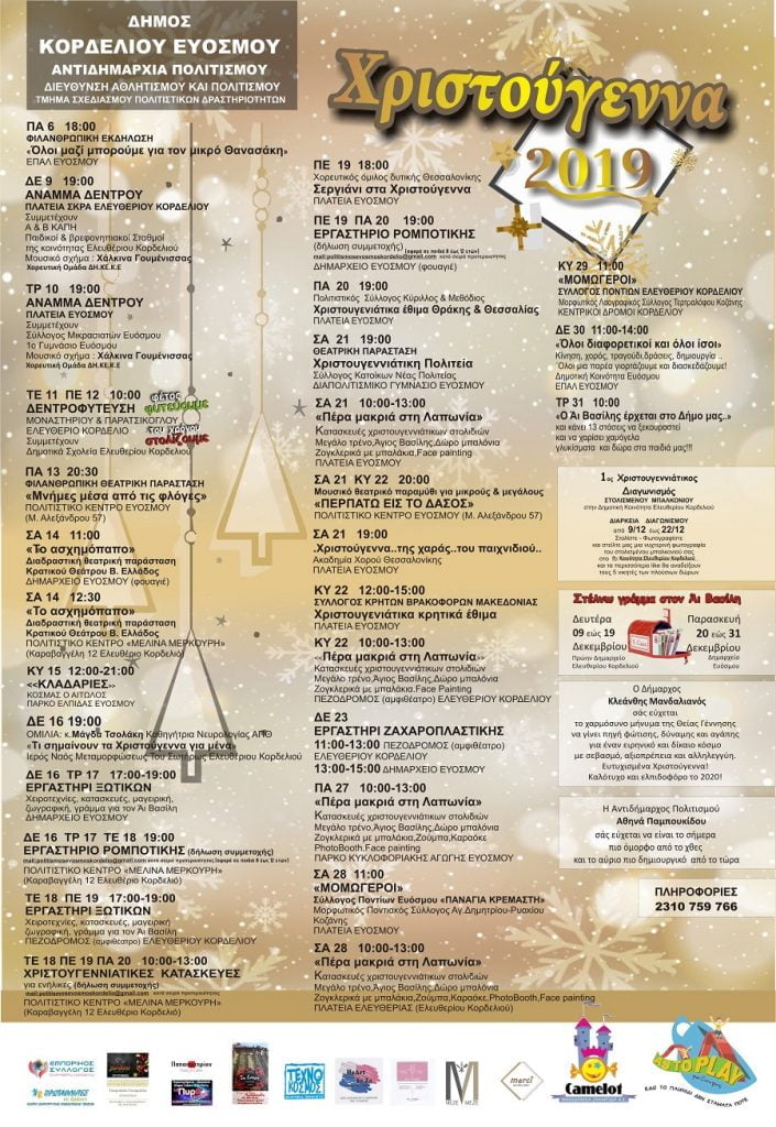 Φέτος ο Δήμος Κορδελιού Ευόσμου δια της Αντιδημαρχίας Πολιτισμού, σε συνεργασία με όλες τις Αντιδημαρχίες, τις δύο Κοινότητες, τα Νομικά Πρόσωπα και τις υπηρεσίες του Δήμου με 41 Χριστουγεννιάτικες φωτεινές, φιλανθρωπικές, παραδοσιακές, οικολογικές μέχρι και διαγωνιστικές δράσεις απόλυτα εναρμονισμένες με το πνεύμα των Χριστουγέννων αλλά και πολλές καινοτομίες ανοίγουν την αυλαία των Χριστουγεννιάτικων εκδηλώσεων και από σήμερα Παρασκευή 6.12.2019 έως την Τρίτη 31.12.2019 στέλνουν το μήνυμα της αγάπης, της αλληλεγγύης, της προσφοράς, του παιγνιδιού αλλά κυρίως του νέου οράματος, προς όλους του δημότες.
