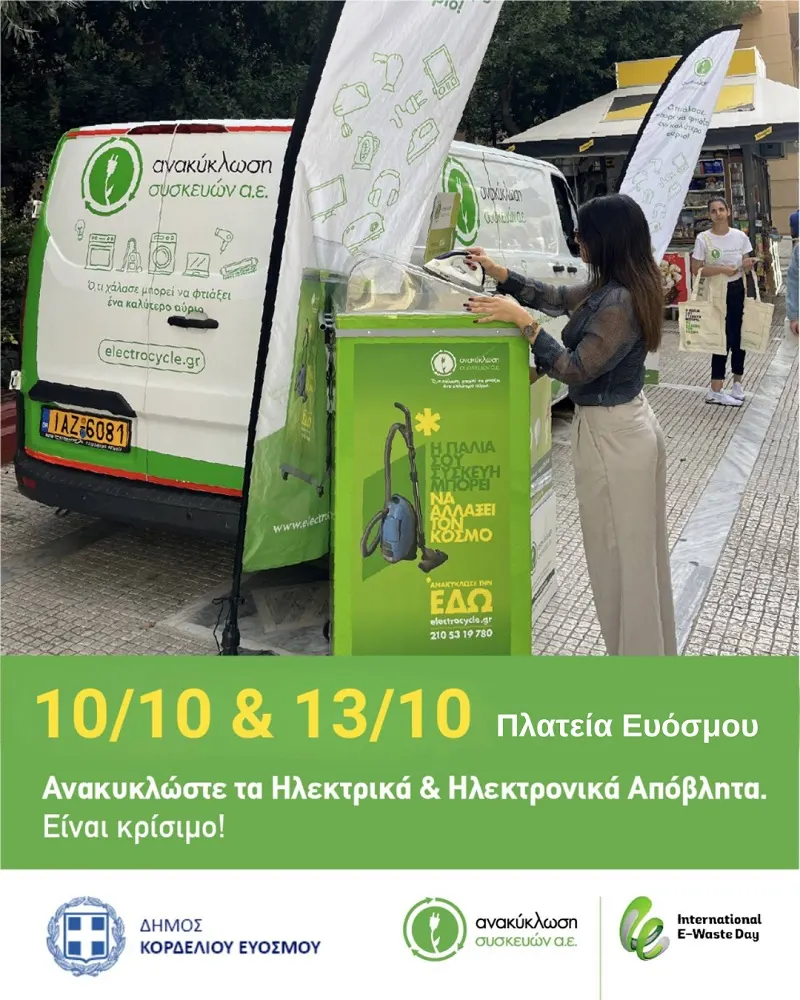 Πιο συγκεκριμένα, η Ανακύκλωση Συσκευών ΑΕ, σε συνεργασία με τη ΔΙΑΔΥΜΑ ΑΕ, θα επισκεφτούν την κεντρική πλατεία του Ευόσμου, όπου οι δημότες θα έχουν τη δυνατότητα να ανακυκλώσουν τις μικρές ηλεκτρικές και ηλεκτρονικές συσκευές με εύκολο και άμεσο τρόπο σε ειδικά διαμορφωμένο όχημα van.