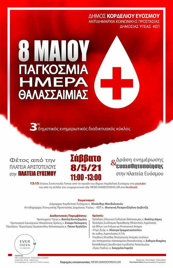 O Δήμος Κορδελιού Ευόσμου δια της Αντιδημαρχίας Κοινωνικής Προστασίας και Δημόσιας Υγείας ΚΕΠ συνδιοργανώνουν με τον Ελληνικό Σύλλογο Θαλασσαιμίας (ΕΣ.ΘΑ), και τον Σύνδεσμο Προώθησης Εθελοντικής Αιμοδοσίας και Φίλων των Ατόμων με Μεσογειακή Αναιμία «Πηγή Ζωής», την Παγκόσμια Ημέρα Θαλασσαιμίας (Μεσογειακής Αναιμίας).