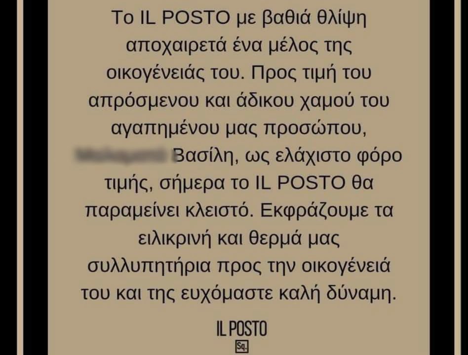 Προς τιμή του απρόσμενου και άδικου χαμού του αγαπημένου μας προσώπου, Βασίλη Μ., ως ελάχιστο φόρο τιμής, σήμερα το IL POSTO θα παραμείνει κλειστό. Εκφράζουμε τα ειλικρινή και θερμά μας συλλυπητήρια προς την οικογένεια του και της ευχόμαστε καλή δύναμη.