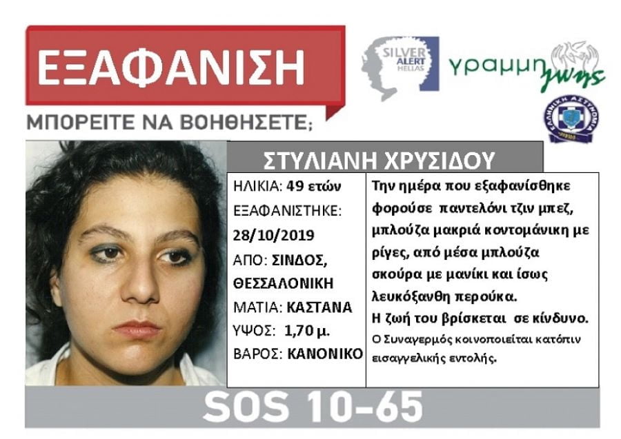 Την εξαφάνιση της 49χρονης Στυλιανής Χρυσίδου γνωστοποιεί με ανακοίνωσή της, η Γραμμή Ζωής από την περιοχή της Σίνδου, στη Θεσσαλονίκη.