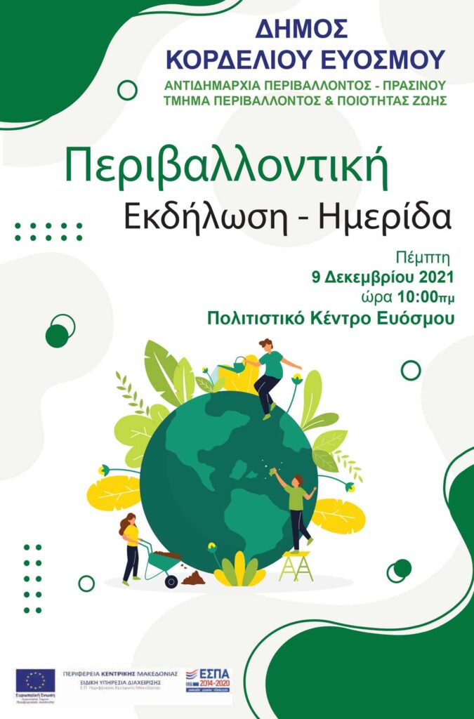Τα κρίσιμα και καίρια περιβαλλοντικά ζητήματα που αντιμετωπίζει ο πλανήτης, με αιχμή το πρόβλημα της Κλιματικής Αλλαγής, τίθεται στο επίκεντρο της ενημερωτικής εκδήλωσης που διοργανώνει ο Δήμος Κορδελιού Ευόσμου δια του Τμήματος Περιβάλλοντος και Ποιότητας Ζωής, την Πέμπτη 9 Δεκεμβρίου στις 10.00πμ στο Πολιτιστικό Κέντρο Ευόσμου (Μ. Αλεξάνδρου 57).