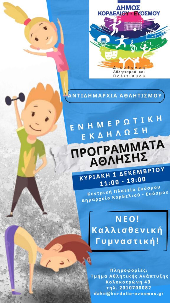 Την ευκαιρία να ενημερωθούν για τα όλα προγράμματα άθλησης του Δήμου Κορδελιού – Ευόσμου θα έχουν μικροί και μεγάλοι την Κυριακή 1 Δεκεμβρίου 2024, από τις 11:00 έως τις 13:00, στην πλατεία Ευόσμου, μπροστά στο Δημαρχείο.