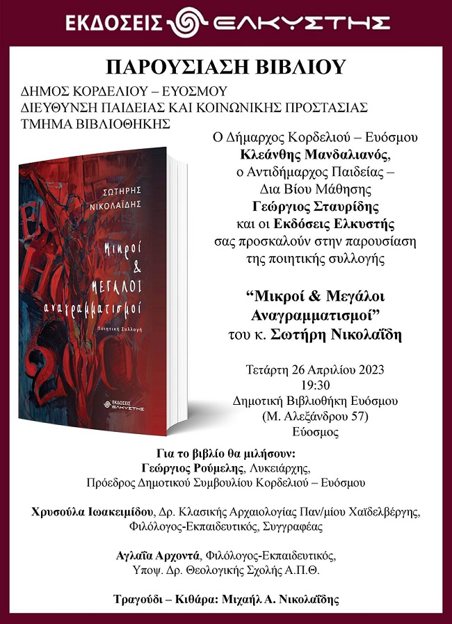 Ο Δήμαρχος Κορδελιού Ευόσμου Κλεάνθης Μανδαλιανός, ο Αντιδήμαρχος Παιδείας Δια Βίου Μάθησης Γεώργιος Σταυρίδης και οι Εκδόσεις Ελκυστής προσκαλούν στην παρουσίαση «Μικροί και Μεγάλοι Αναγραμματισμοί» του κ. Σωτήρη Νικολαΐδη σήμερα Τετάρτη 26 Απριλίου, στις 7:30 το απόγευμα, στη Δημοτική Βιβλιοθήκη Ευόσμου (Μ. Αλεξάνδρου 57).