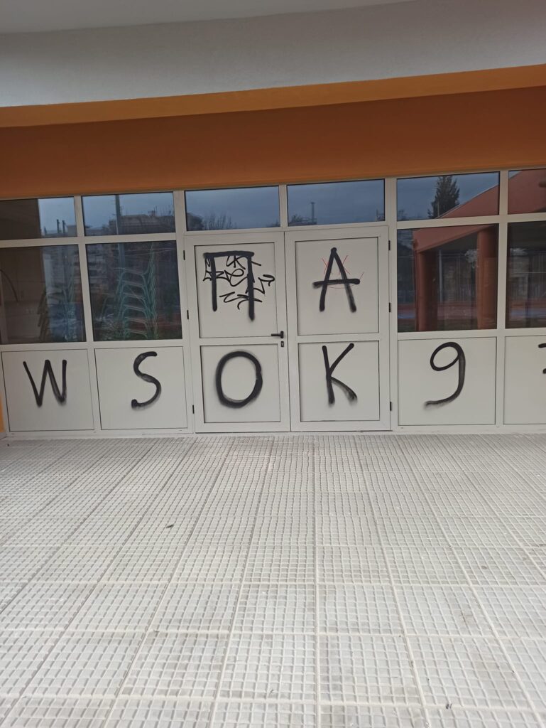 ‘Αγνωστοι έγραψαν συνθήματα με σπρέι σε τοίχους και τις βρύσες του σχολείου που είναι υπό ολοκλήρωση.
