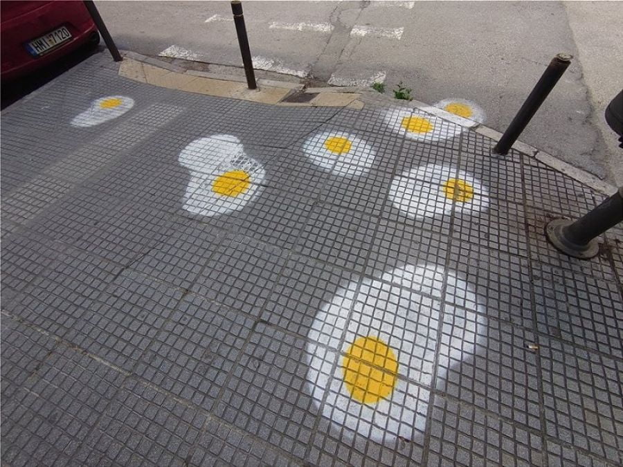Σ’ αυτούς «απευθύνονται» τα …τηγανητά αβγά «μάτια» που υπάρχουν σε διάφορα πεζοδρόμια στο κέντρο, στη Βασ. Όλγας αλλά και σε άλλα τυχαία σημεία της πόλης. Μια αναπάντεχη συστάδα από γκράφιτι με κεντρικό «ήρωα» το τηγανητό αβγό που αιφνιδιάζει ευχάριστα!