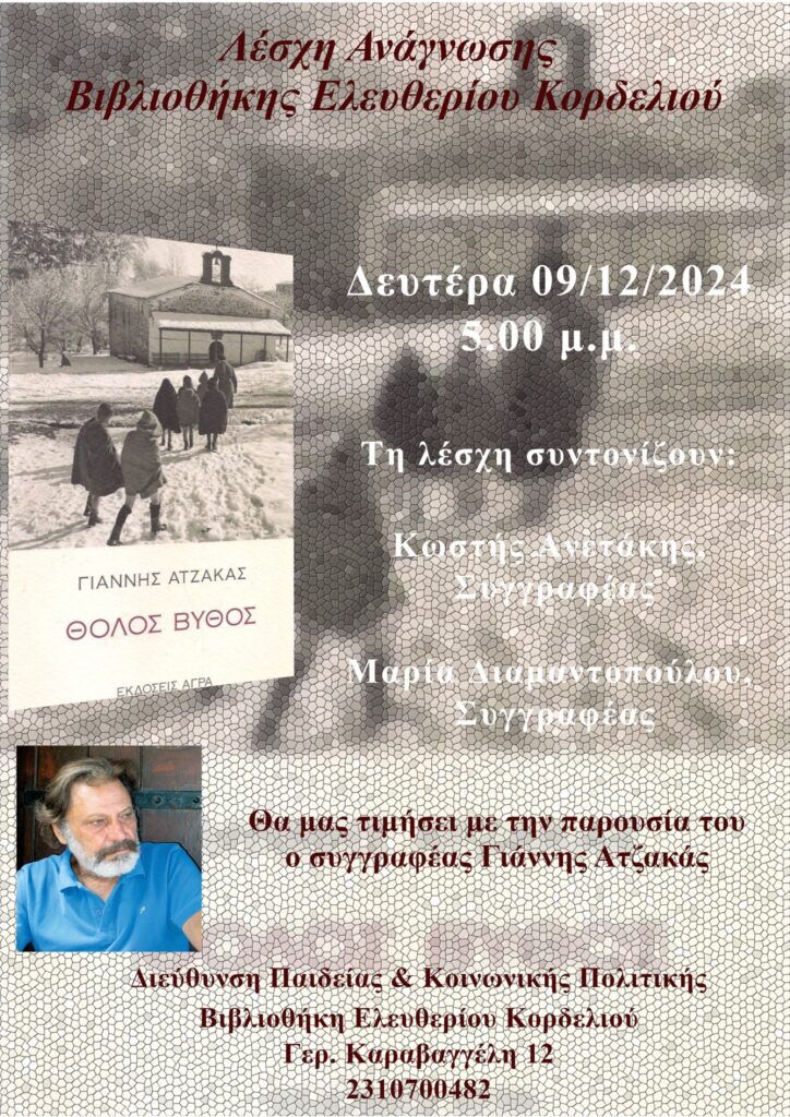 Το βιβλίο του βραβευμένου συγγραφέα Γιάννη Ατζακά “Θολός Βυθός”, που τιμήθηκε το 2009 με το κρατικό βραβείο μυθιστορήματος, πραγματεύεται η νέα συνάντηση της Λέσχης Ανάγνωσης της δημοτικής βιβλιοθήκης Ελευθερίου Κορδελιού.