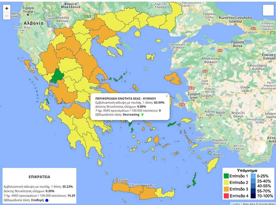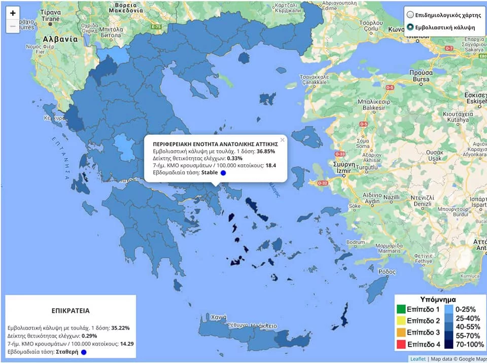 Οπως γράφει στην ανάρτησή του, οι δυο νέοι διαδραστικοί χάρτες παρακολουθούν την εξέλιξη της πανδημίας και του εμβολιασμού σε επίπεδο περιφερειακής ενότητας (και δήμου στα νησιά) έχουν πλέον αναρτηθεί στο https://covid19.gov.gr/covid-map.