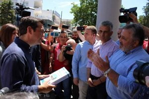 Λίγο πριν το τέλος της βόλτας του ο Αλέξης Τσίπρας συνομίλησε και με τον δήμαρχο του δήμου Κορδελιού- Ευόσμου, Κλεάνθη Μανδαλιανό. Ο κ. Μανδαλιανός χάρισε στον πρόεδρο του ΣΥΡΙΖΑ ένα βιβλίο.