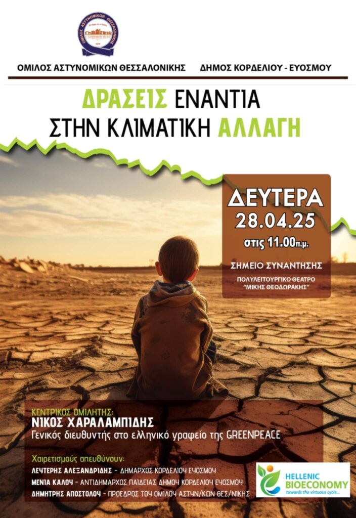 Αναγνωρίζοντας τη σημασία της παιδείας ως θεμέλιο για τη διαμόρφωση υπεύθυνων πολιτών και απαντώντας στην ανάγκη ευαισθητοποίησης της νέας γενιάς απέναντι στην κλιματική αλλαγή — τη σοβαρότερη απειλή της εποχής μας — ο Δήμος Κορδελιού – Ευόσμου αναλαμβάνει δράση, διοργανώνοντας σε συνεργασία με τη διεθνή περιβαλλοντική οργάνωση Greenpeace και τον Όμιλο Αστυνομικών Θεσσαλονίκης, ημερίδα με θέμα «Δράσεις ενάντια στην Κλιματική Αλλαγή».