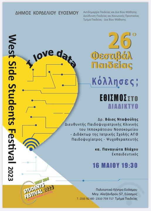 Η εξάρτηση των παιδιών αλλά και των ενηλίκων από το διαδίκτυο, οι διαστάσεις και οι επιπτώσεις της ιδιότυπης αυτής σχέσης, οι τρόποι πρόληψης και αντιμετώπισης του φαινομένου, τίθενται στο επίκεντρο της ενημερωτικής εκδήλωσης που διοργανώνει στο πλαίσιο του Φεστιβάλ Παιδείας 2023 με θέμα “I love data”, η Αντιδημαρχία Παιδείας – Δια Βίου Μάθησης, την Τρίτη 16 Μαΐου στις 19.30μμ στο Πολιτιστικό Κέντρο Ευόσμου (Μ. Αλεξάνδρου 57).