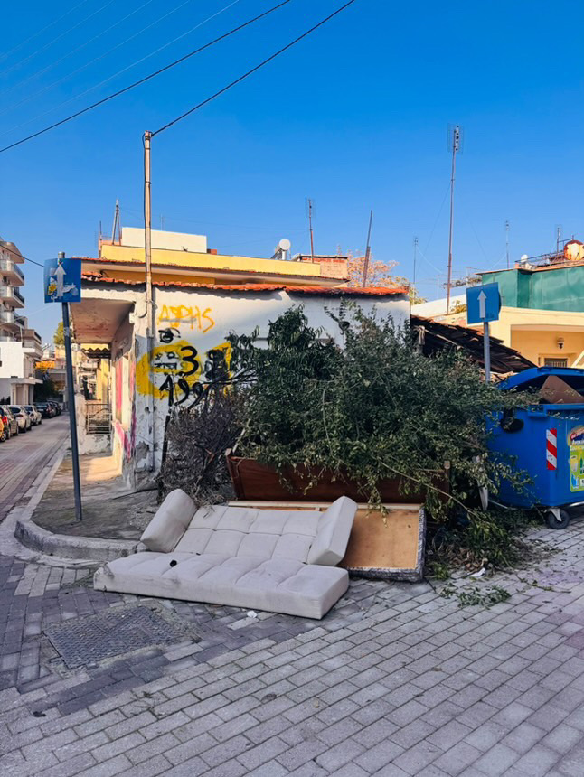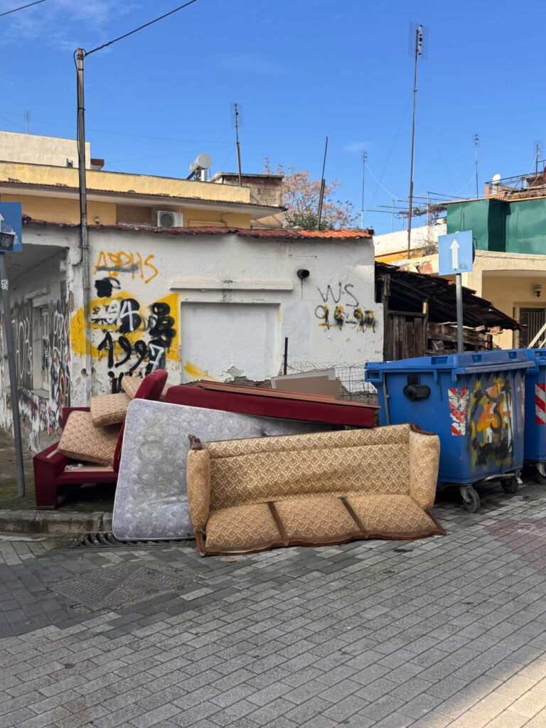 Μια καθημερινή εικόνα εγκατάλειψης περιγράφουν κάτοικοι στις οδούς Αρτέμιδος και Αργυροκάστρου, με σωρούς ογκωδών αντικειμένων – καναπέδες, στρώματα, κλαδιά και διάφορα έπιπλα – να παραμένουν στο ίδιο σημείο εδώ και τρεις εβδομάδες.