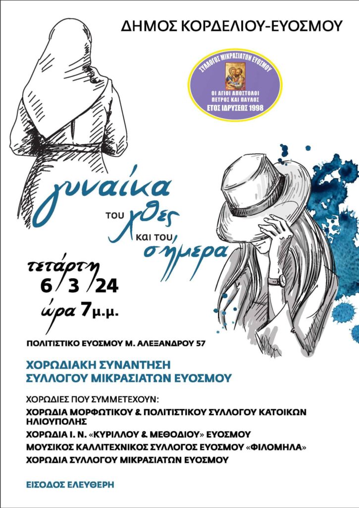Ο Σύλλογος Μικρασιατών Ευόσμου «ΟΙ ΑΓΙΟΙ ΠΕΤΡΟΣ ΚΑΙ ΠΑΥΛΟΣ», με αφορμή την Ημέρα της Γυναίκας, οργανώνει την Τετάρτη 6.3.2024 στις 7.00μμ στο Πολιτιστικό Κέντρο Ευόσμου Μ. Αλεξάνδρου 57 μία μια μεγάλη Μουσική Συνάντηση με θέμα « Γυναίκα του χθες και του σήμερα» με Τραγούδια γραμμένα για την Γυναίκα και αφιερωμένα στη Γυναίκα, σε απόδοση από τις Χορωδίες
