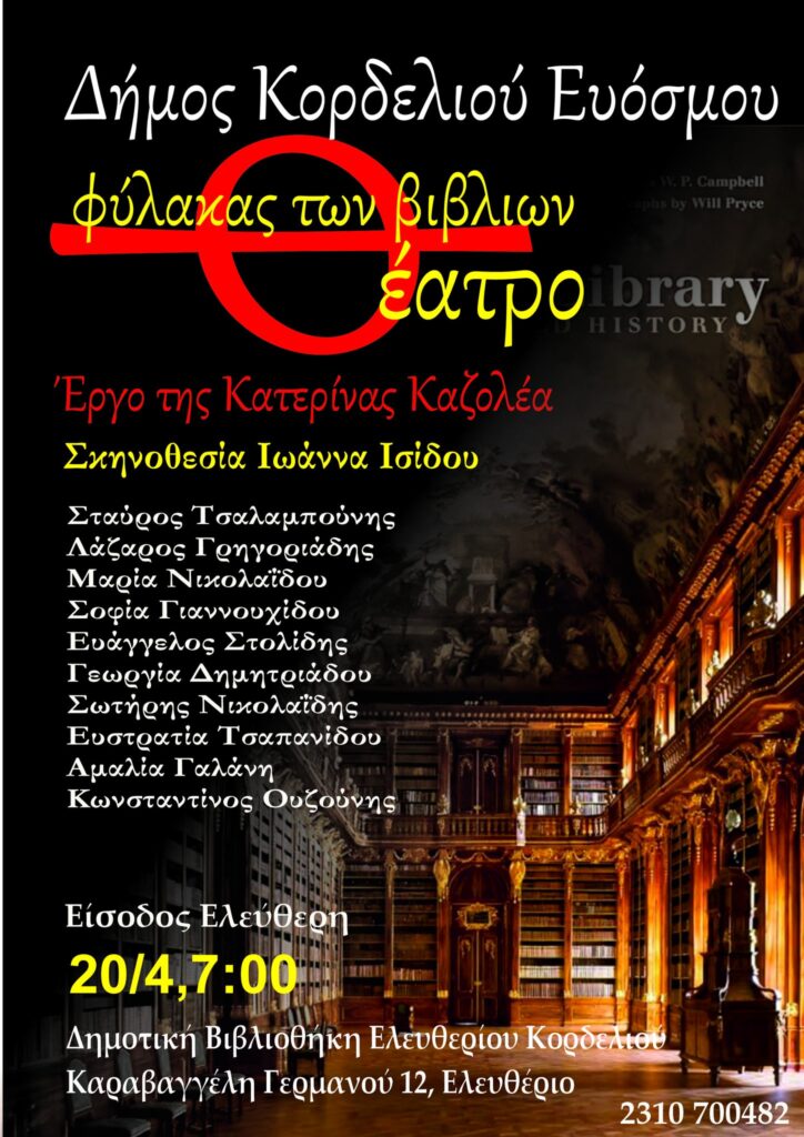 Μετά τη θερμή ανταπόκριση που γνώρισε η παράσταση της Ομάδας Θεάτρου της Δημοτικής Βιβλιοθήκης Ευόσμου «Ο Φύλακας των Βιβλίων», της Κατερίνας Καζολέα, επιστρέφει δυναμικά αυτή τη φορά στη Δημοτική Βιβλιοθήκη Ελευθερίου Κορδελιού για να συναντήσει νέους θεατές, μεταφέροντας τη μαγεία του θεάτρου μέσα στον φυσικό χώρο της Βιβλιοθήκης. Εκεί όπου τα βιβλία, τα ράφια και οι γνώριμες γωνιές μετατρέπονται σε ζωντανό μέρος της αφήγησης, προσφέροντας μια εμπειρία άμεση, συμμετοχική και βαθιά ανθρώπινη.