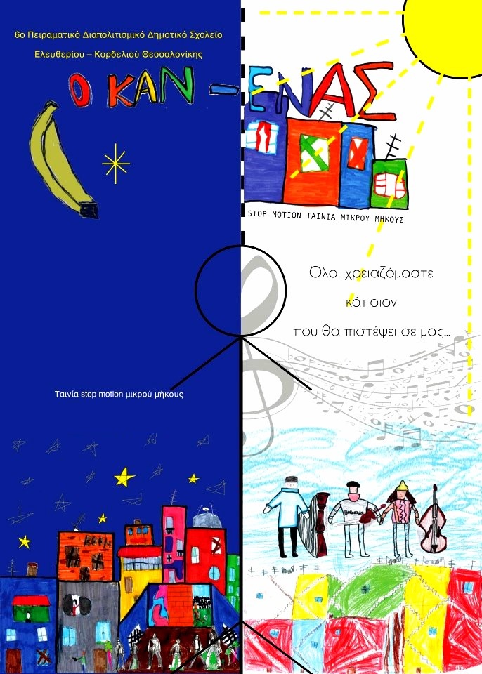 To 6o Πειραματικό Διαπολιτισμικό ΔΣ Ελευθερίου Κορδελιού, με μια νέα εξαιρετική ταινία stop motion μικρού μήκους βωβού κινηματογράφου με τον τίτλο: «Ο καν-Ένας», ταξιδεύει για πρώτη φορά εκτός Θεσσαλονίκης για τις φεστιβαλικές αίθουσες της χώρας και – δείχνει σε όλους εμάς – πώς είναι να μην έχεις ταυτότητα, ότι φτώχεια δεν είναι μόνο η έλλειψη τροφής & στέγης και πώς είναι να κάνεις όνειρα…