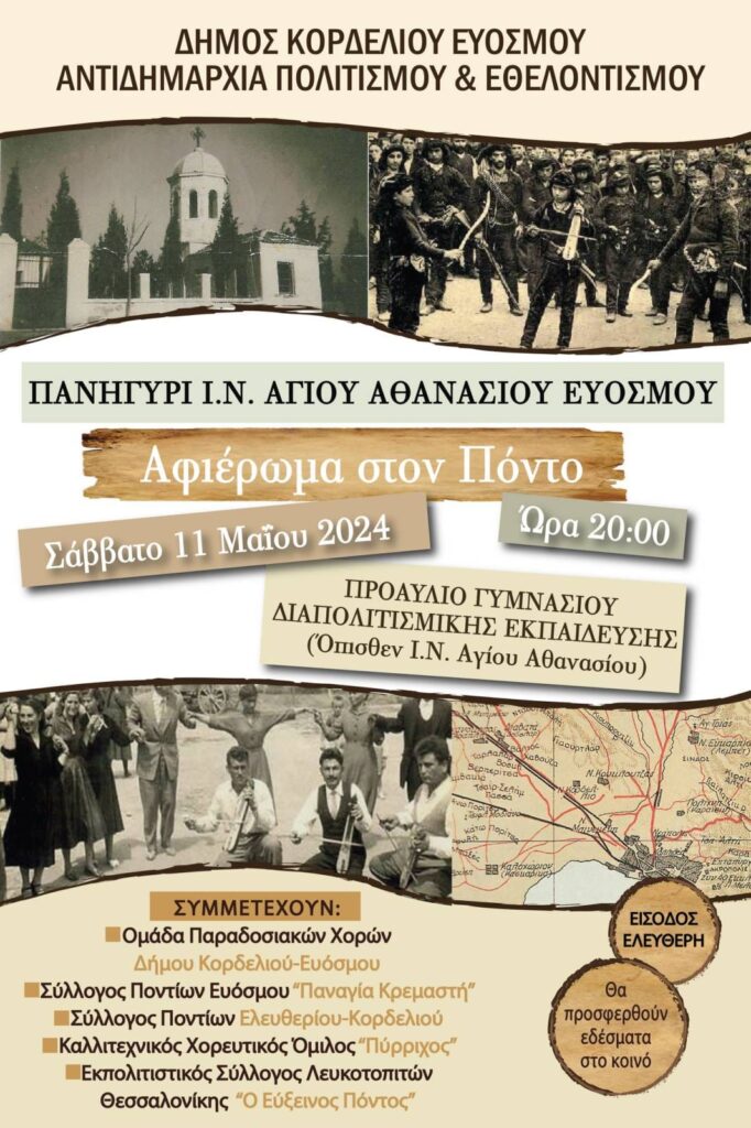 Στο πλαίσιο των εκδηλώσεων για τον Ι.Ν. Αγίου Αθανασίου στον Εύοσμο, ο Δήμος Κορδελιού-Ευόσμου/Αντιδημαρχία Πολιτισμού και Εθελοντισμού πραγματοποιεί φέτος αφιέρωμα στον Πόντο, το Σάββατο, 11 Μαϊου, στις 8 το βράδυ στο προαύλιο Γυμνασίου Διαπολιτισμικής Εκπαίδευσης.