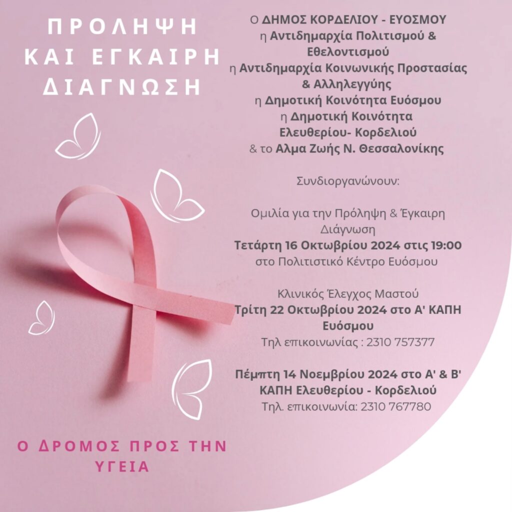 Η Αντιδημαρχία Πολιτισμού & Εθελοντισμού του Δήμου Κορδελιού – Ευόσμου, υπό την αιγίδα της οποίας πραγματοποιούνται όλες οι δράσεις, σε συνεργασία με την Αντιδημαρχία Κοινωνικής Προστασίας & Αλληλεγγύης, τη Δημοτική Κοινότητα Ευόσμου και τη Δημοτική Κοινότητα Ελευθερίου Κορδελιού και με τη στήριξη του Άλματος Ζωής, διοργανώνει μια σειρά από εκδηλώσεις και δράσεις για την ευαισθητοποίηση και την ενημέρωση της τοπικής κοινωνίας σχετικά με την πρόληψη και έγκαιρη διάγνωση του καρκίνου του μαστού.