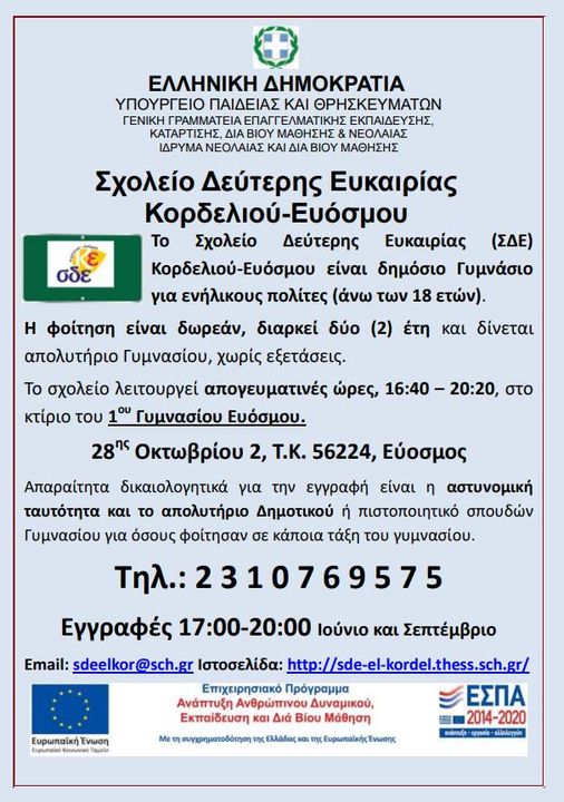 Οι εγγραφές στο Σχολείο Δεύτερης Ευκαιρίας ΣΔΕ Κορδελιού-Ευόσμου για το νέο σχολικό έτος 2023-24 ξεκίνησαν .