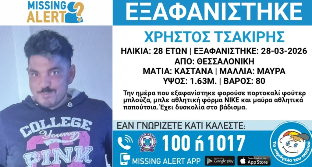 Στις 28 Μαρτίου 2026, εξαφανίστηκε από την Θεσσαλονίκη, ο Χρήστος Τσακίρης, 28 ετών.