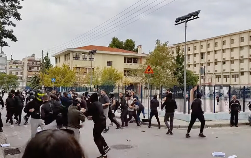 Οι εικόνες από τα άγρια επεισόδια προκαλούν σοκ. Έξω από το 1ο-2ο ΓΕΛ Σταυρούπολης, στη δυτική Θεσσαλονίκη, άτομα με κουκούλες και κράνη επιτίθενται και καδρόνια και σουγιάδες στα φοιτητές.