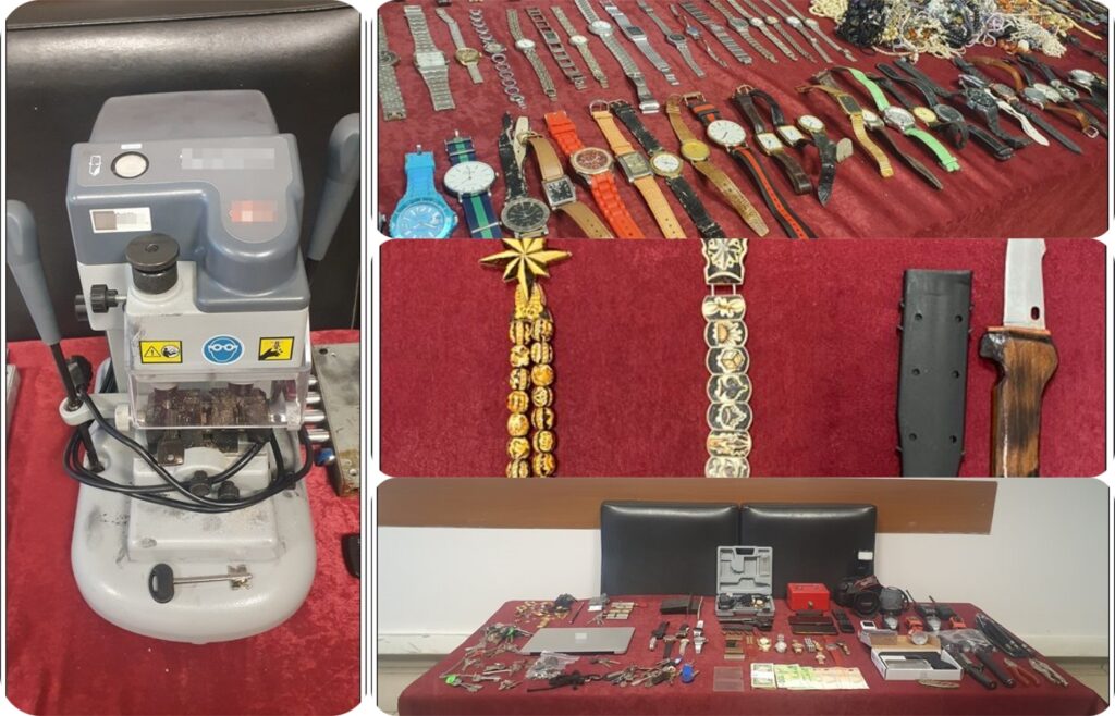 - Πλήθος κλειδιών θυρών οικιών διαφόρων τύπων και μαρκών με εμφανείς εξωτερικές παραποιήσεις – παρεμβάσεις, αυτοσχέδιων διαρρηκτικών εργαλείων διαφόρων κλειδαριών και τύπων, μηχανισμών κλειδαριών θωρακισμένων θυρών, ομφαλών θυρών,