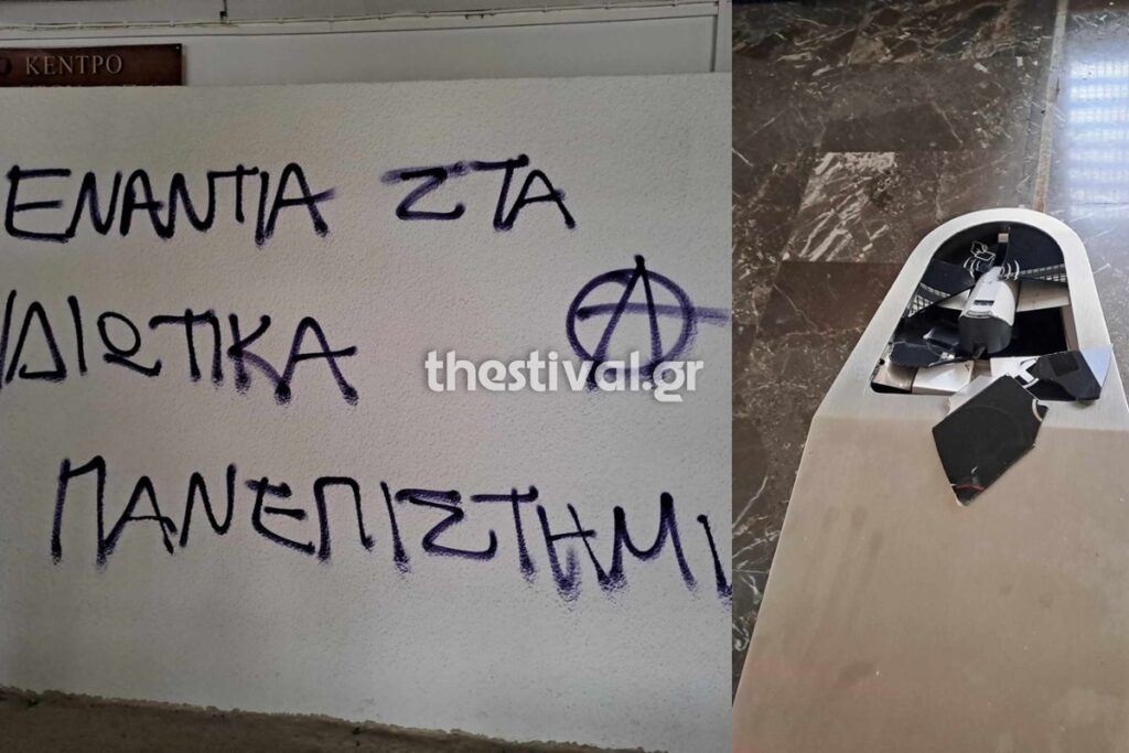 Συγκεκριμένα, λίγο μετά τη 1 το μεσημέρι, στις 17 Ιανουαρίου 2024, δύο άτομα με καλυμμένα τα χαρακτηριστικά του προσώπου τους, “μπούκαραν” στο κτήριο Διοίκησης του ΑΠΘ, έβαψαν σε τοίχο με σκούρο μπλε σπρέι τη φράση: “Ενάντια στα ιδιωτικά πανεπιστήμια” και είχαν σπάσει το ένα τουρνικέ που υπάρχει στην είσοδο.