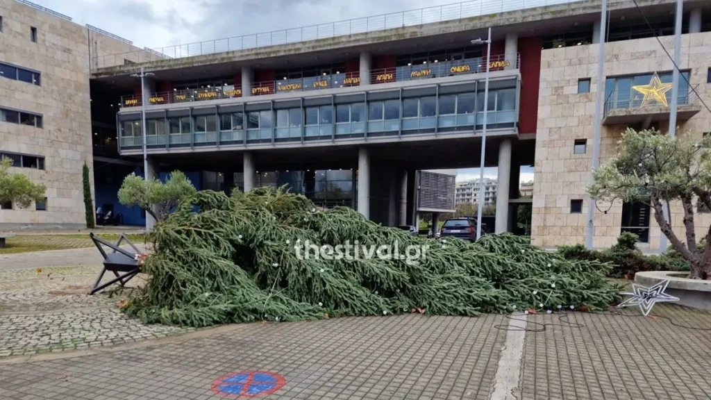 Κατέρρευσε σήμερα το πρωί, το χριστουγεννιάτικο δέντρο που είχε στηθεί μπροστά στο δημαρχείο Θεσσαλονίκης εξαιτίας των ισχυρών ανέμων που έχουν προκληθεί από την κακοκαιρία Byron που έχει «χτυπήσει» την χώρα μας τις τελευταίες ώρες.