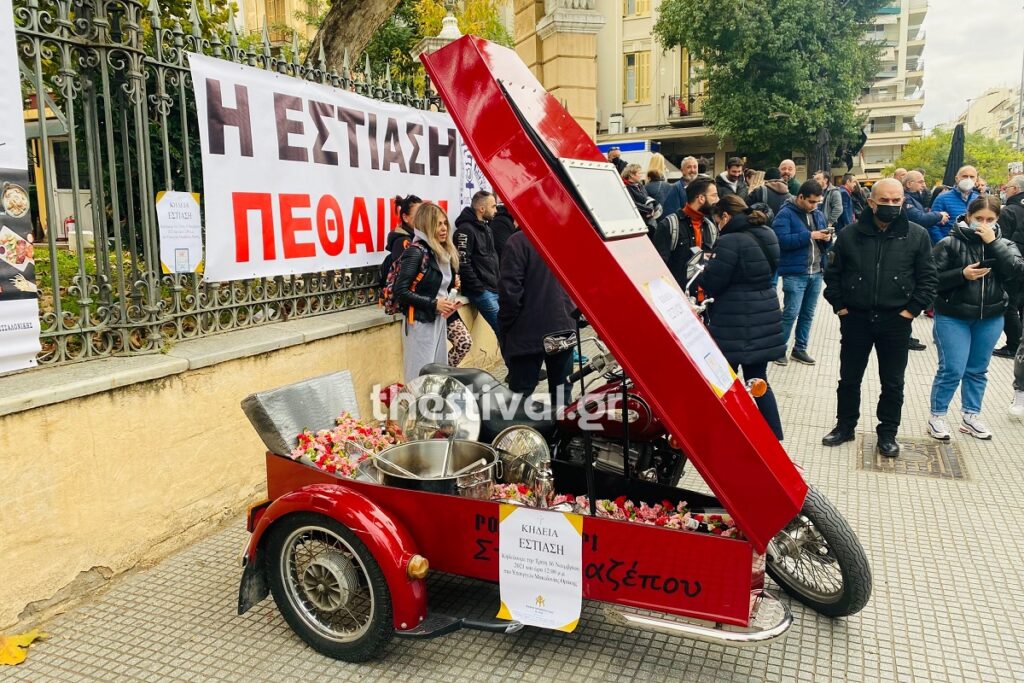 Ζητώντας βιώσιμα μέτρα στήριξης μέλη της Ένωσης Εστιατόρων Καφέ Μπαρ και Ψητοπωλών νόμου Θεσσαλονίκης πραγματοποιούν αυτή την ώρα διαμαρτυρία έξω από το υφυπουργείο Μακεδονίας – Θράκης, στο πλαίσιο της πανελλαδικής απεργίας στον κλάδο της εστίασης.