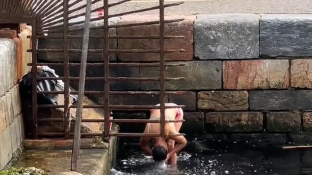 Με το νερό να φτάνει μέχρι τα γόνατα η η κοπέλα έλουσε τα μαλλιά της, προκαλώντας απορίες για την κίνησή της αυτή.
