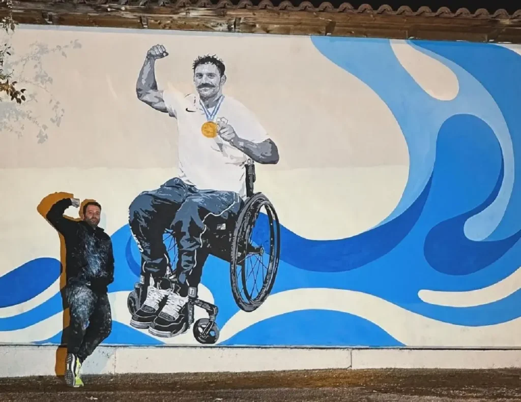 Πέντε μέρες χρειάστηκε ο εκπαιδευτικός και δημιουργός τοιχογραφιών, Μάριος Σιμόπουλος, ώστε να απαθανατίσει τον Αντώνη Τσαπατάκη, να πανηγυρίζει το χρυσό μετάλλιό του στην κολύμβηση στο Παγκόσμιο Πρωτάθλημα της Πορτογαλίας το 2022. Με ακρυλικά χρώματα και πινέλα, ο εικαστικός έδωσε χρώμα στον τοίχο του 2ου Δημοτικού Σχολείου Ευόσμου, γεμίζοντας τον με μια από τις σημαντικότερες στιγμές στην καριέρα του χρυσού παραολυμπιονίκη.