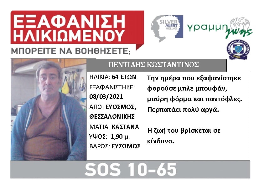 Τα ίχνη του Κωνσταντίνου Πεντίδη, 64 ετών, χάθηκαν τη Δευτέρα 8/3/21 από τον Εύοσμο Θεσσαλονίκης.