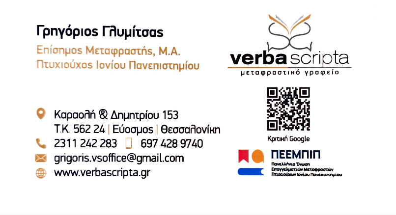 Ο Γρηγόριος Γλυμίτσας, υπεύθυνος του Γραφείου Verba Scripta, ως τακτικός μέλος ο ίδιος της Πανελλήνιας Ένωσης Επαγγελματιών Μεταφραστών Πτυχιούχων Ιονίου Πανεπιστημίου (ΠΕΕΜΠΙΠ) και της Πανελλήνιας Ένωσης Μεταφραστών (ΠΕΜ), μέλη της FIT και της EULITA, εγγυάται την ολοκληρωμένη και εξειδικευμένη παροχή επίσημων και επικυρωμένων μεταφράσεων από την Αγγλική, Γερμανική και Γαλλική προς την Ελληνική Γλώσσα και αντιστρόφως, αλλά και μεταξύ των ξένων γλωσσών, αποδεκτών από φορείς σε Ελλάδα και εξωτερικό.