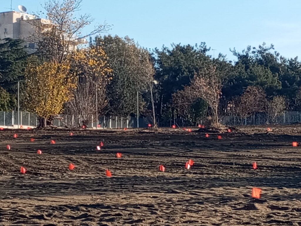Με τις πρώτες βροχές είναι έτοιμο το έδαφος για τις δενδροφυτεύσεις και τοποθετήθηκαν τα κόκκινα σημαιάκια στα σημεία όπου θα μπουν τα δέντρα, ώστε σε σύντομο διάστημα να πρασινίσει το πάρκο που θα υποδέχεται επισκέπτες από όλη την πόλη.